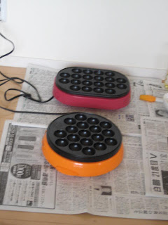 We made takoyaki at Naoko-san's house. Here she is ladling the batter onto the grills. |