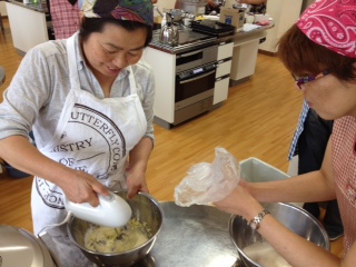 Cooking class is fast paced and always a flurry of people running back and forth, looking at other groups and making sure they are doing things correctly. For some reason, everyone is concerned they will do something wrong. If Ishige san sees a group adding an ingredient before its time or (heaven forbid) mixing something the wrong way, she swoops in, scolds the wrong-doer and finishes the task herself. Everything must be done a certain way. You'd think that these women never cooked a day in their life they way they act sometimes! I always find myself laughing when this happens and from time to time, if a group does something wrong, they will try and clean up the evidence quickly before Ishige san notices. :)